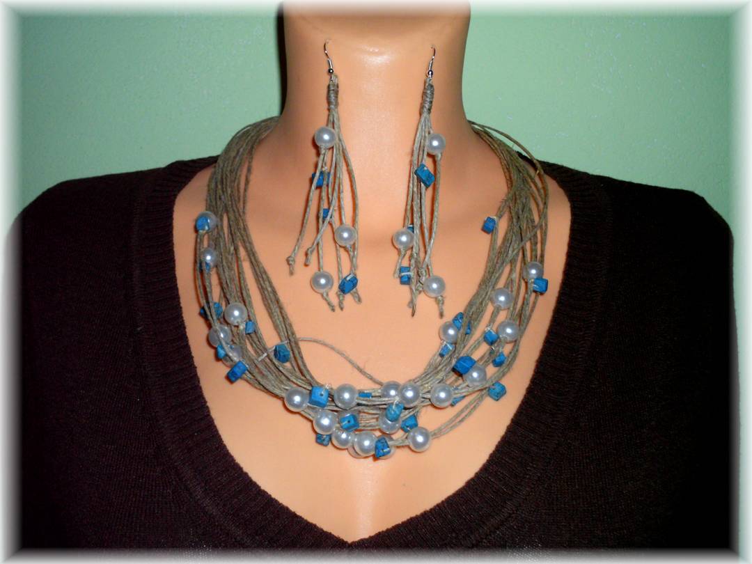 Sznurek lniany, białe koraliki perłowe, naturalny turkus kostka